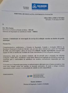 A interrupção foi comunicada oficialmente à Secretaria da Saúde do Estado da Bahia (Sesab) em ofÃcio da Diretoria de Regulação, Controle e Avaliação da Secretaria Municipal da Saúde, assinado em 31 de março. No documento, a Prefeitura de Salvador informa que o serviço deixaria de ser ofertado já no dia seguinte e admite não haver previsão de retomada.