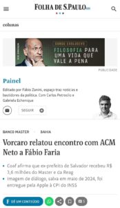 A informação consta em conversa de WhatsApp entre Vorcaro e o ex-ministro Fábio Faria, recuperada em investigação da CPI mista do INSS. Na mensagem, o ex-banqueiro diz: “ACM foi lá em casa”, sugerindo um encontro fora de agendas públicas e em ambiente privado.